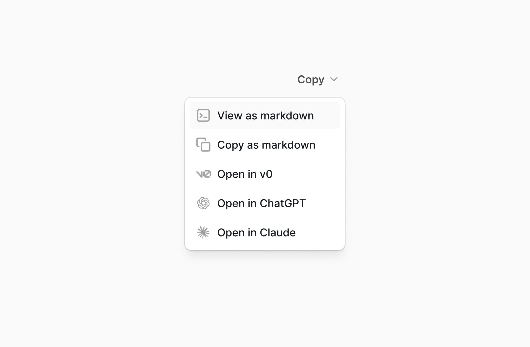 Use the new "Copy as" dropdown on the docs site to copy React components and layouts as markdown. Open them directly in v0, ChatGPT, or Claude to generate or modify interfaces with AI.
