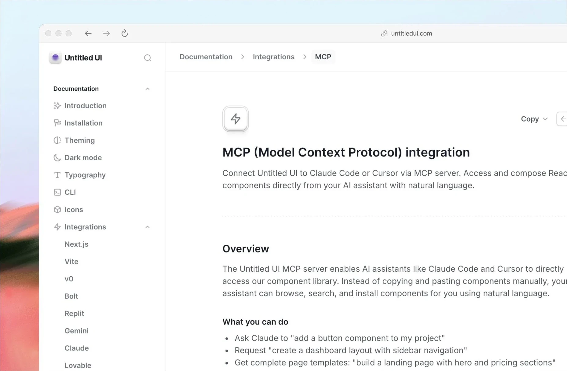 Untitled UI now supports MCP (Model Context Protocol), allowing AI tools like Claude Code and Cursor to browse, search, and install components using natural language.